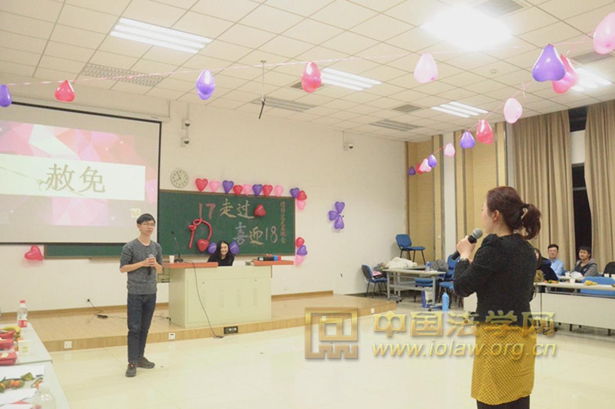 青春遇芳华,新年送吉祥!2017年12月28日晚七点,2018年法学系元旦班级联谊会在中国社会科学院研究生院教学楼222教室拉开帷幕。中国社会科学院法学研究所经济法研究室主任、法学系副主任兼法硕办主任席月民老师,特邀嘉宾人民网人民体育公司总经理游海滨老师,法硕办副主任刘晨琦老师,法制史研究室王帅一老师、法硕办郝倩倩老师、张硕老师、柳羽倩老师、李辉老师,与法学系各年级同学欢聚一堂,辞旧岁、迎新年,共同欣赏了这场热情洋溢、青春飞扬的师生联欢会。