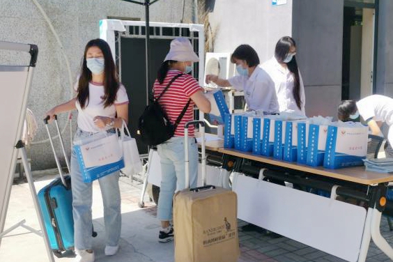 9月4日上午7时左右,望京校区各相关部门工作人员在校门口、宿舍等地点各自就位,等待着学子们的归来。法硕中心在席月民主任的安排下,张硕老师、郝俊淇老师、柳羽倩老师、张初霞老师、于宜平老师等班主任,第一时间给返校同学们送上了一声声亲切问候,引导同学们查验健康码、测温,领取防疫物资,提交相关材料等。沉寂已久的校园,在一拨拨同学返校后重新恢复了生机。
