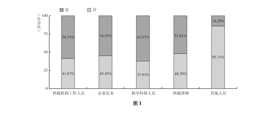 某个纠纷是否具有法律意义上的可仲裁性直接影响仲裁法的适用范围。对于修法是否可以修改现行《仲裁法》第2条,增加规定明确投资纠纷、PPP合同纠纷等其他有关合同或财产权益纠纷的可仲裁性,受访国内专家意见分歧较大。有53.92%的受访国内专家回答“是”;46.08%回答“否”。从受访国内专家职业群体的交叉分析来看(见图1),这种分歧普遍存在于仲裁机构工作人员、企业法务、教学科研人员和仲裁律师群体中,职业因素影响并不显著。相对而言,教学科研人员赞同修改的比例较高,而在反对修改的受访专家中,仲裁律师的比例较高。受访国际仲裁专家的倾向性意见是应当对《仲裁法》第2条进行修改。如联合国贸法会秘书处认为,扩大可仲裁性范围可为当事人提供更多机会,以其选择的方式解决纠纷。黄锡义表示,现在第2款的规定未将普通法项下的可仲裁情形包括在内,普通法的做法是承认所有争议都具有可仲裁性,除非法律明确规定不可仲裁。