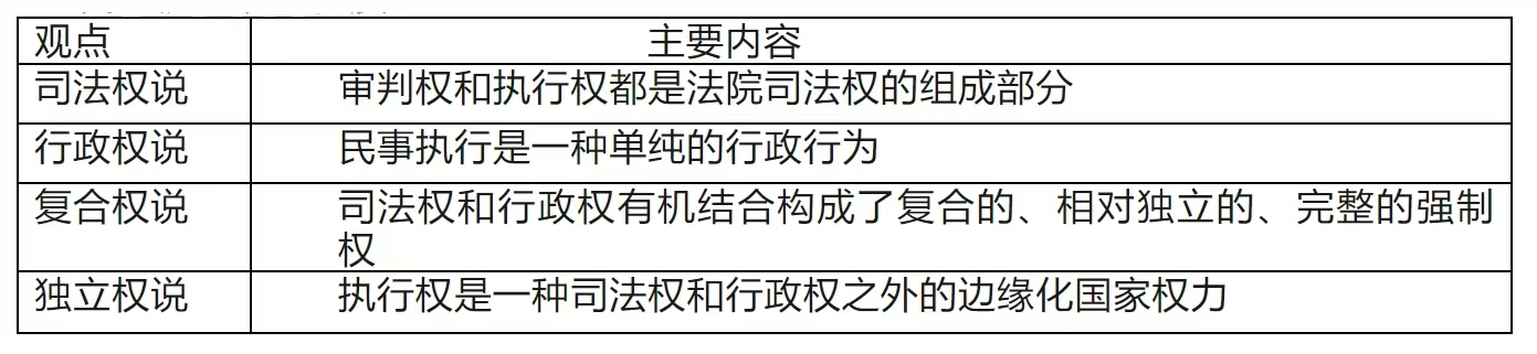 民事执行与民事执行权是两个既紧密联系又有所区别的概念。民事执行是执行机关行使民事执行权的活动,而民事执行权本身是一种抽象的国家权力,需要通过民事执行来具体地实现。国内学者对于民事执行权的性质,学界分歧较大,尚未形成通说。具有代表性的主要有以下几种观点(见下表):